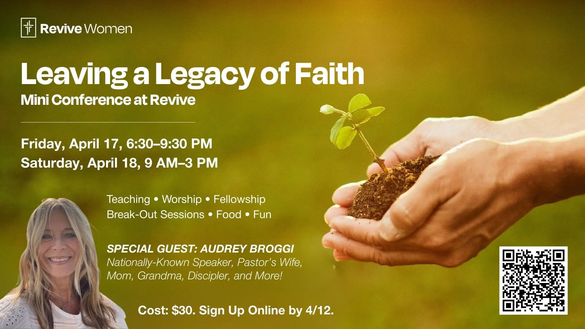 Ladies, we're so excited for the upcoming mini-conference on Friday, April 17, 6:30–9:30 PM and Saturday, April 18, 9 AM–3 PM! What does it mean to leave a legacy of faith in our families, workplace, church, and community? We'll look into the Word of God to find answers that will guide and direct us to intentionally live as Christ lived so the next generation will also follow Jesus.